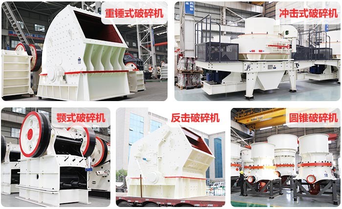 颚式破碎机是粗碎,产量1-2200t/h可选;反击式破碎机和圆锥式破碎机用于中细碎,反击破适合破碎较软的物料,产量是30-800t/h,圆锥破碎机用于硬度比较高的物料,产量是12-2128t/h;重锤式破碎机是一款可一次性成品的破碎机,产量160-1100t/h;制砂机用于石料的制砂和细碎整形功能,产量12--585t/h。