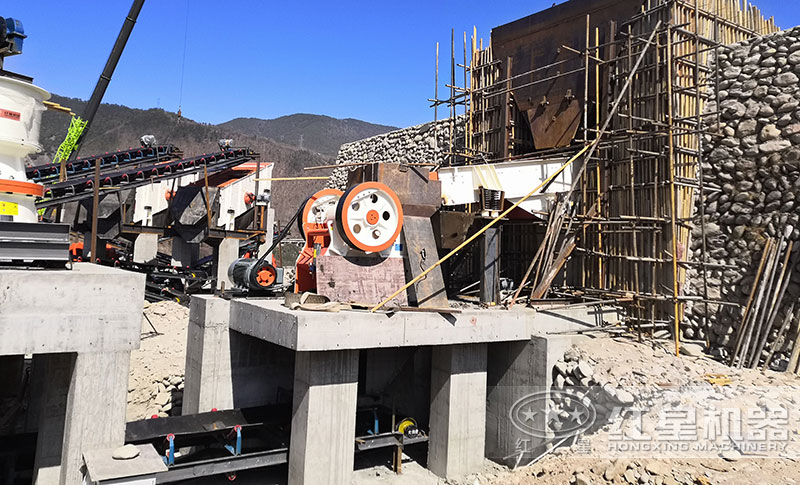 石头原料经料仓由振动给料机均匀喂料,输送到颚式破碎机进行粗碎,粗碎后的物料经振动筛筛分后,加工之后的石料粒度在100mm以下规格,这种碎石粒度一般适合一些大面积公路铺路石子使用,要想使石子粒度达到5-10mm规格那么还需要进行二级细碎破碎;